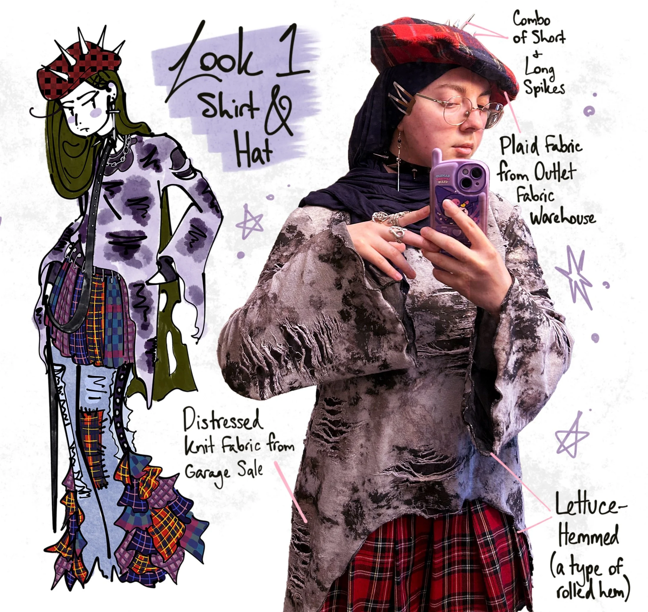 The shirt and hat were successfully made with a few modifications, such as changing the fabric for the hat due to a wool buffalo plaid not being available nearby, and adjusting the row of long spikes to a combination of short and long spikes around the center of the hat