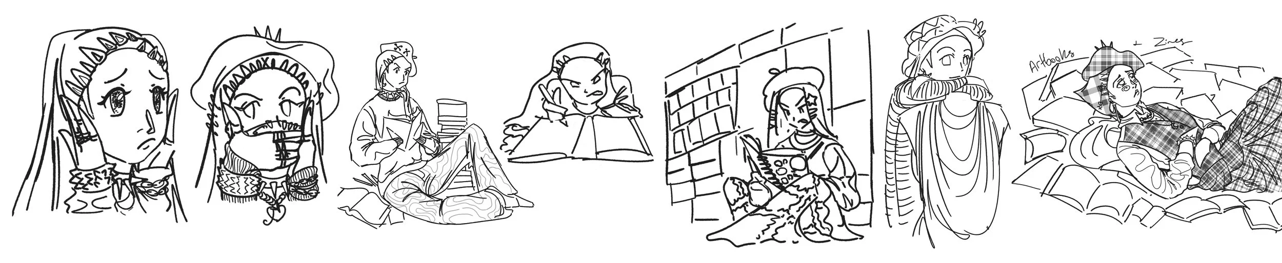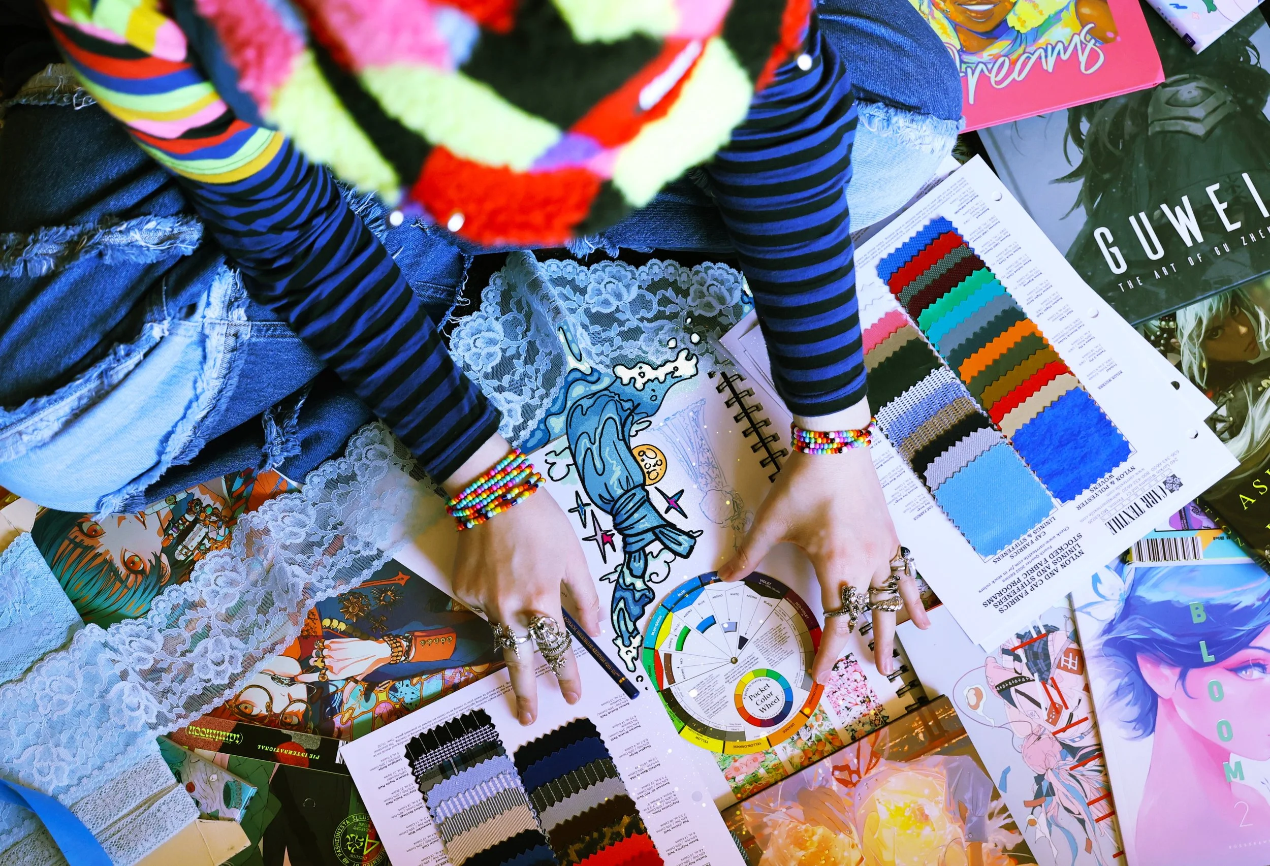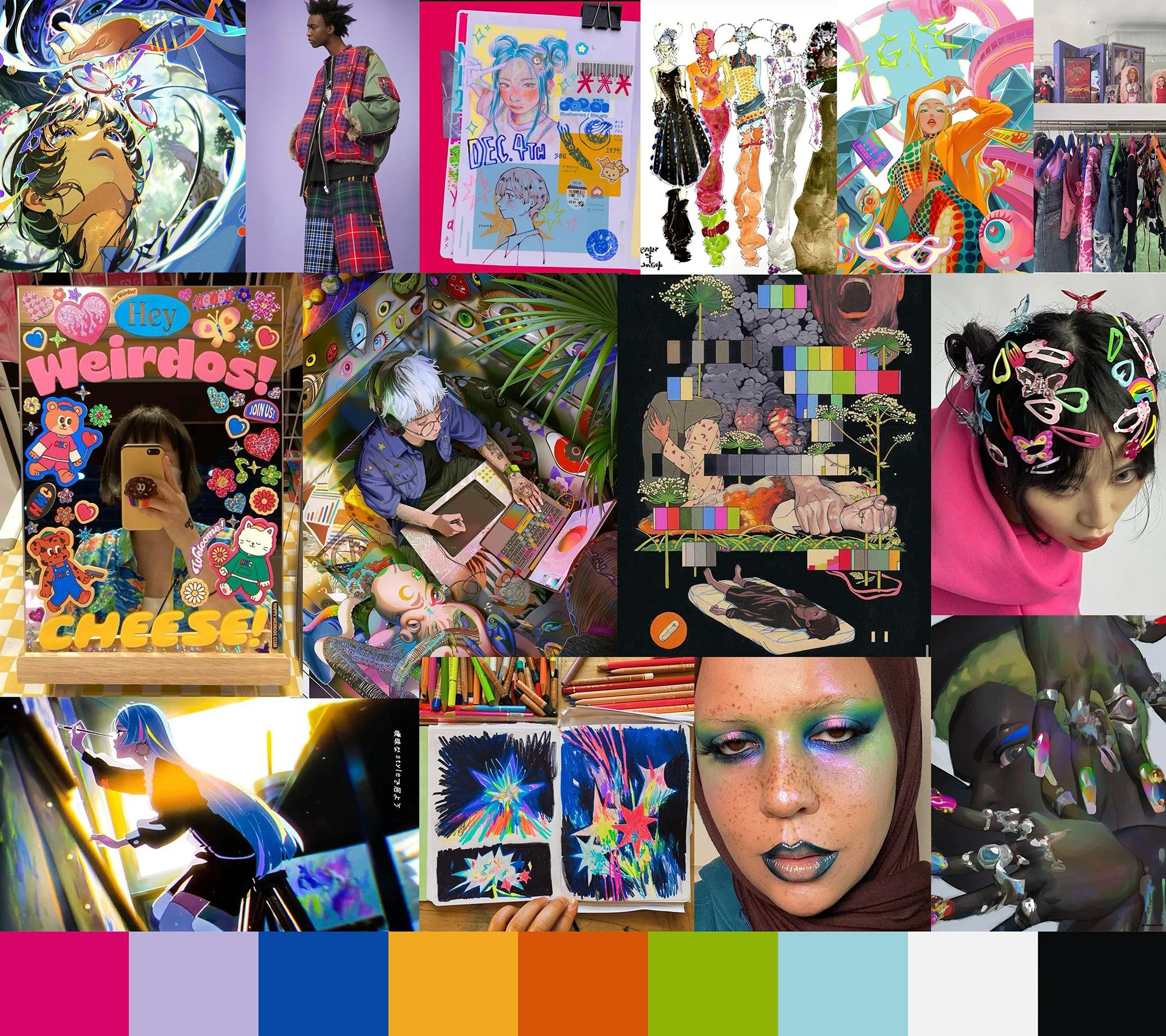 Inspired by an animated music video I love, “Yoku” by Eve, the artists I grew up loving and have befriended along the way, and the ways people combine art with fashion, I wanted to create a photoshoot that creatively showed my artistic influences and upbringing with this journey of being a fashion student and the highs and lows that come with it. On the right is the moodboard, and below are some composition sketches.